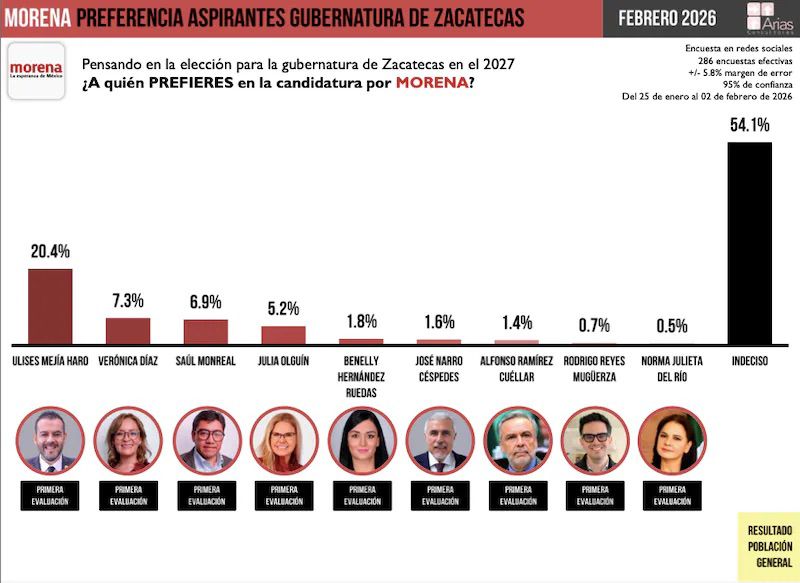 Un estudio nacional de opinión pública perfila a Ulises Mejía Haro como el aspirante con mayor respaldo dentro de Morena en Zacatecas. La medición, aplicada entre el 25 de enero y el 2 de febrero de 2026, refleja que el exalcalde mantiene una diferencia significativa frente a sus contendientes, duplicando […]