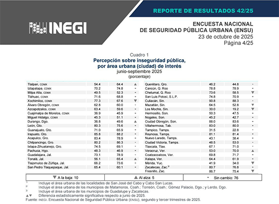“CONTINÚA A LA BAJA PERCEPCIÓN DE INSEGURIDAD EN ZACATECAS Y FRESNILLO”: INEGI