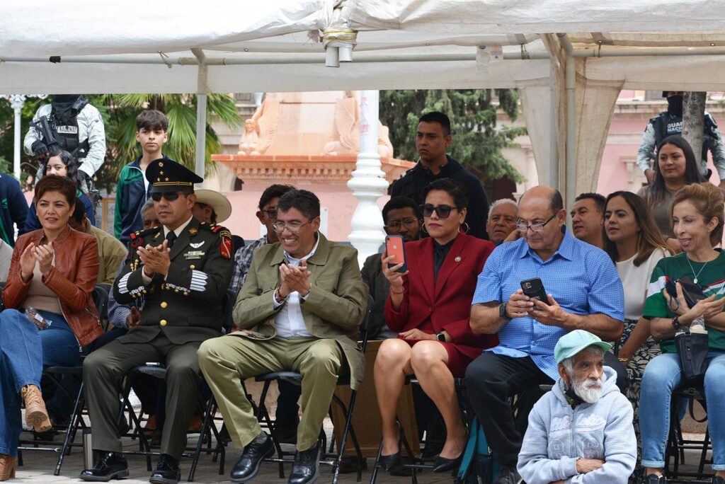 El presidente Saúl Monreal Ávila presenció el desfile desde el Jardín Obelisco con la compañía especial de Karina Macías, vicealcaldesa de Huntington Park, California; Lou Correa, Congresista de California; Sergio Infanzon, director de Comunicaciones de Huntington Park; Loly Trejo, presidenta del Club de Migrantes Zacatecanos en Los Ángeles; y Manuel Alejandro Gutiérrez Alonzo, comandante del 97/o. Batallón de Infantería.