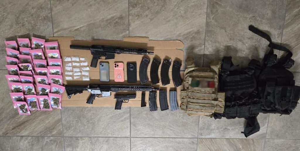 Durante la acción operativa, se aseguraron un vehículo Volkswagen Bora, así como dos armas de fuego largas y un arma corta, 10 cargadores, 65 cartuchos útiles, tres chalecos balísticos, equipos de comunicación, además de 30 envoltorios con hierba verde y seca con características de la marihuana, y 15 envoltorios con sustancia granulada similar a la droga conocida como cristal.