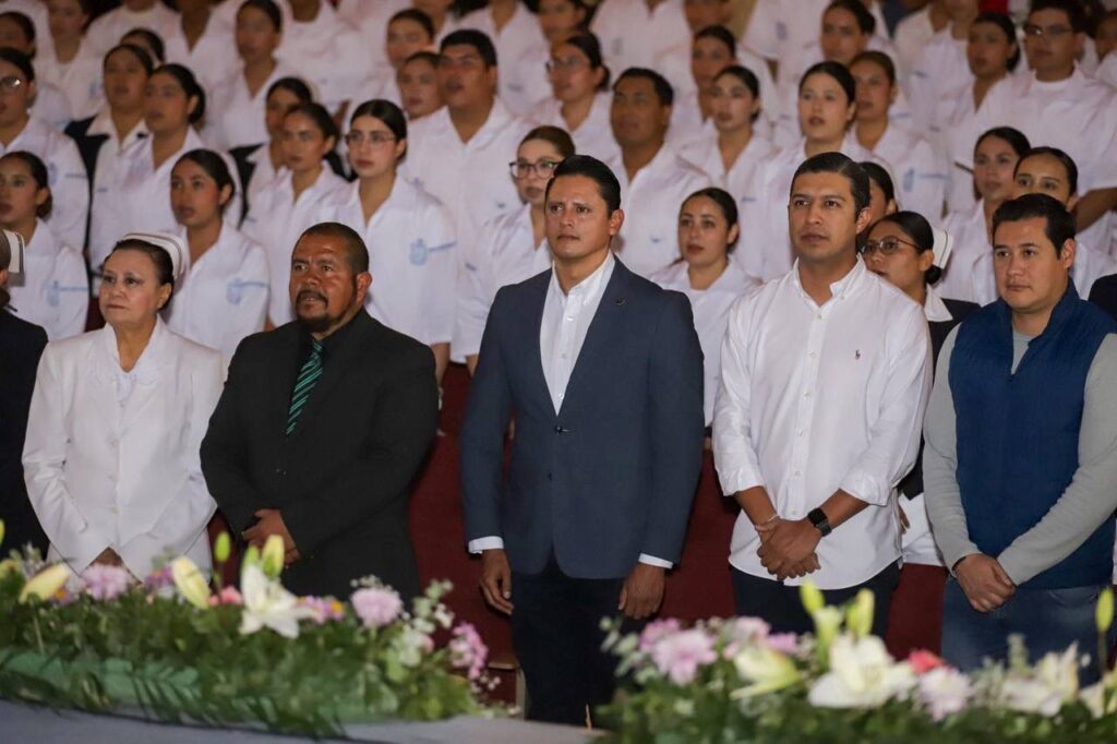 David Eduardo Paniagua, secretario técnico, a nombre del alcalde Javier Torres Rodríguez felicitó a los 42 alumnos de la licenciatura y 63 de enfermería general quienes recibieron su cofia y gafete con orgullo y dedicación, iniciando un paso más en su profesionalización.