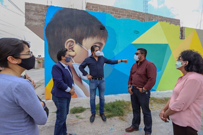 Personal del Departamento de Desarrollo Urbano se encargó de realizar el mural, en el que se plasma la actualidad de los niños fresnillenses ante la pandemia y el apoyo que reciben de sus padres y amigos para afrontar la nueva convivencia social.