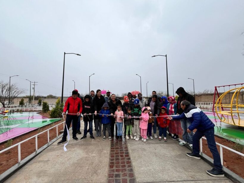 Recibida con la lluvia, la presidenta Rita Quiñones arribó a la comunidad Presa del Mezquite para entregar a sus habitantes la plaza que el Gobierno de Fresnillo construyó. Ella incluye un pequeño parque infantil, para que los pequeños tengan un espacio digno en el que puedan jugar.