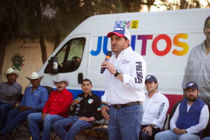 Javo Torres, candidato a la Presidencia Municipal por la coalición Fuerza y Corazón Por Zacatecas, junto al presidente estatal del Partido Revolucionario Institucional, Carlos Peña, realizó una visitó a la comunidad de El Mezquite como parte de la promoción de su proyecto para Fresnillo, entre los que destacan mejora a la red del drenaje y creación de espacios recreativos.