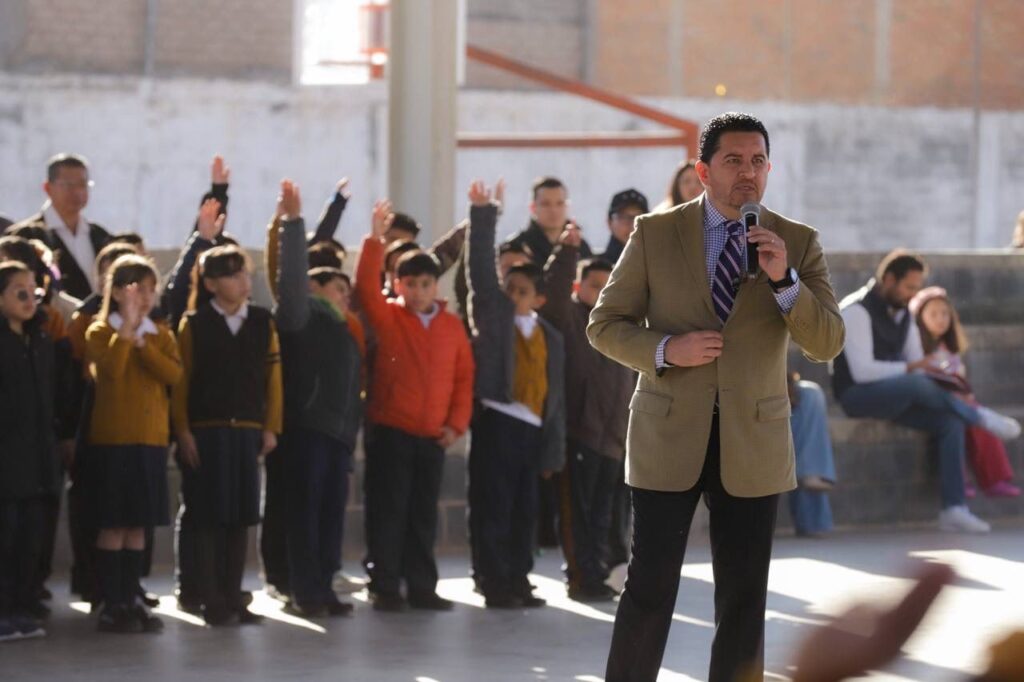 El alcalde Javier Torres Rodríguez presidió la ceremonia cívica de honores a la bandera en la escuela primaria Anexa a la Normal, donde convivió con los alumnos, motivándolos a practicar deporte y refrendó su interés de colaborar con las instituciones del municipio.