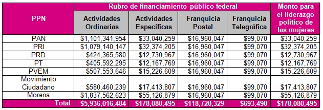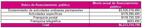 Con base en la fórmula que establece la Constitución mexicana y la Ley General de Partidos Políticos tomando en cuenta los resultados de la elección ordinaria federal para elegir diputaciones federales por el principio de Mayoría Relativa y el porcentaje de votos obtenidos por cada fuerza política, el financiamiento que corresponde a cada partido político y que será discutido esta semana en el Consejo General, es el siguiente: