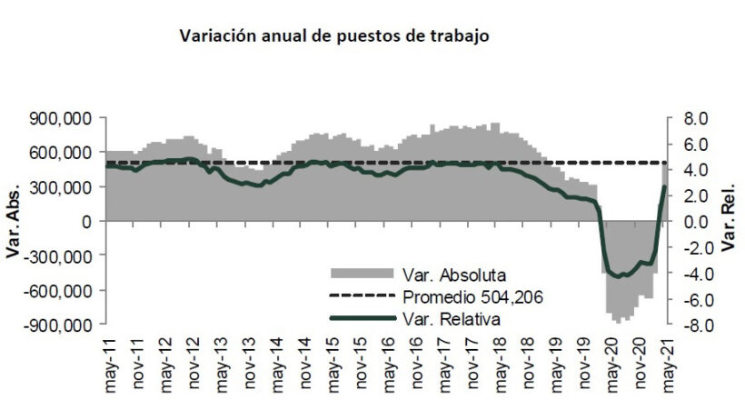 - En los últimos doce meses se registró un aumento de 526,274 (quinientos veintiséis mil doscientos setenta y cuatro) puestos, equivalente a una tasa anual de 2.7% (dos punto siete por ciento).