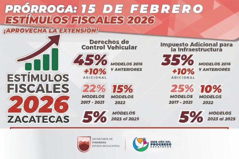 En el marco del Año del Progreso, el Gobierno que encabeza David Monreal Ávila, a través de la Secretaría de Finanzas, informa que los estímulos fiscales aplicables durante enero de 2026 para el control vehicular y diversas contribuciones se extienden y estarán vigentes hasta el 15 de febrero, con el […]