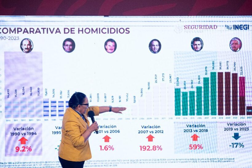 Rodríguez detalló que el promedio diario de víctimas de homicidio doloso bajó 7% en 2023 respecto al año pasado; 15% comparado con 2021; 17% respecto a 2020, el mismo porcentaje en relación a 2019, y 17% si se compara con el inicio del sexenio.