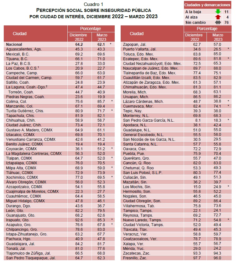 A pesar que la percepción de inseguridad de los mexicanos bajó a 62.1% el primer trimestre de 2023, la ciudad de Fresnillo en el estado de Zacatecas sigue teniendo la mayor percepción de inseguridad en el país, informó este miércoles el Instituto Nacional de Estadística y Geografía (Inegi).