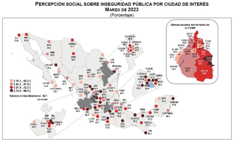 En contraste, la ciudad menos insegura fue San Pedro Garza García, municipio del norteño estado de Nuevo León, considerado el más rico del país, donde solo 18.3% de la población reportó inseguridad.