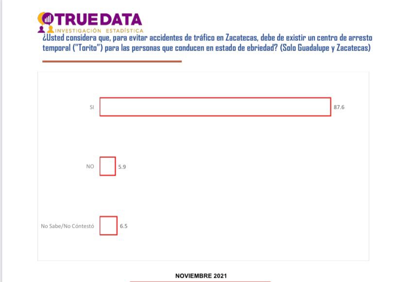 De acuerdo con un estudio demoscópico realizado por la casa encuestadora True Data, el 87.6 por ciento de los zacatecanos se manifestó en favor de que exista un centro de arresto temporal, también conocido como “Torito”, para las personas que conducen en estado de ebriedad. Es decir, prácticamente 9 de cada 10 de las personas encuestadas lo consideraron una medida justa y necesaria para evitar problemas viales relacionados con el consumo excesivo de alcohol.