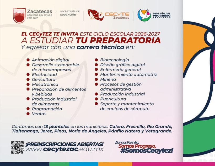 El Colegio de Estudios Científicos y Tecnológicos del Estado de Zacatecas (Cecytez) abrió el periodo de preinscripciones para el Ciclo Escolar 2026-2027; invita a jóvenes que están por egresar de secundaria a formar parte de la preparatoria con mayor presencia y reconocimiento en la entidad.