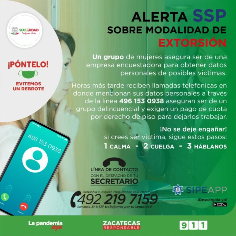 La Secretaría de Seguridad Pública de Zacatecas (SSP) alerta sobre un modo de operar de un grupo delincuencial para obtener información que posteriormente es utilizada para extorsionar ciudadanos y exigir el pago de una cuota por cobro de piso.