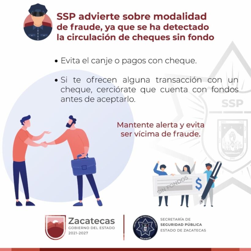 La Secretaría de Seguridad Pública (SSP) exhorta a la población zacatecana a mantenerse alerta y evitar ser víctimas del delito de fraude, ya que, mediante un reporte ciudadano, se denunció el pago y canje de efectivo con cheques sin fondo.