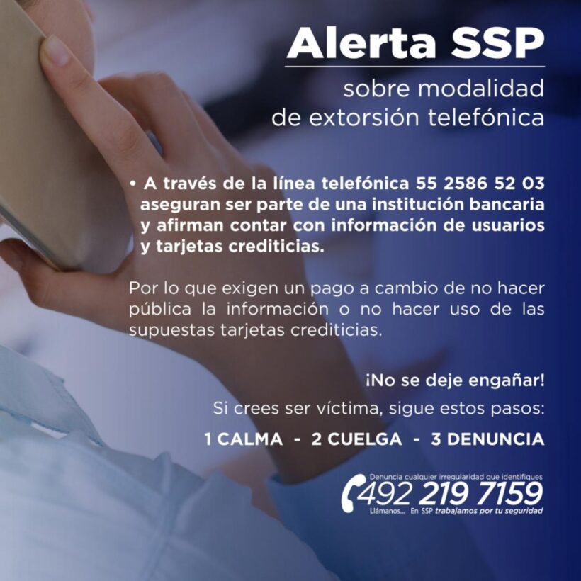 La Mesa Estatal de Construcción de Paz y Seguridad, a través de la Secretaría de Seguridad Pública de Zacatecas (SSP), alerta sobre una modalidad de extorsión en la que sujetos afirman pertenecer a una institución bancaria y tener datos personales de la víctima, por los que piden dinero a cambio de no hacerlos públicos o hacer mal uso de sus tarjetas de crédito.