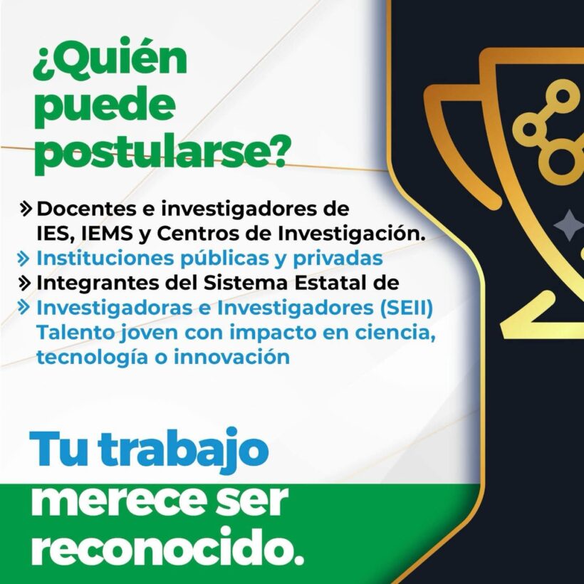 Pueden participar docentes e investigadores adscritos a instituciones de educación superior y media superior de centros de investigación públicos o privados, ubicados en Zacatecas, quienes deben pertenecer al Sistema Estatal de Investigadoras e Investigadores (SEII); las y los estudiantes de posgrado deberán presentar constancia de inscripción, además de aportar evidencia de productividad científica y/o tecnológica, generada entre el 1 de enero y el 31 de diciembre de 2025.