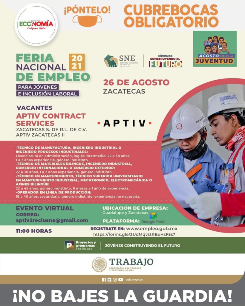 El próximo jueves 26 de agosto, el Gobierno del Estado realizará de manera virtual la Feria Nacional de Empleo para Jóvenes e Inclusión Laboral, en la cual 16 empresas ofertarán más de 300 vacantes para operarios, técnicos y profesionistas. Será en esta modalidad para prevenir el contagio y propagación del Coronavirus (COVID-19).