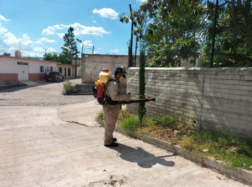 Entre las acciones que realizan las brigadas del programa de vectores, se encuentra el rociado intradomiciliario en las viviendas, así como en edificios públicos, entre los que se enlistan escuelas, iglesias, hospitales, comercios y otros.