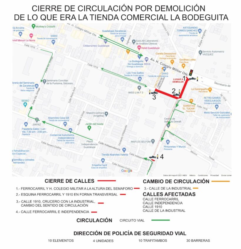 Con la finalidad de garantizar la seguridad de transeúntes y conductores del municipio de Guadalupe, autoridades de la Dirección de Policía de Seguridad Vial (DPSV) alistan un operativo de cierre vehicular sobre los cruceros de la avenida Colegio Militar con calles Ferrocarril, 1910 e Industrial, con motivo de la demolición de la estructura de lo que era la tienda comercial La Bodeguita.
