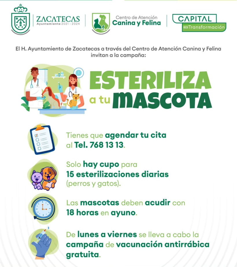 El Ayuntamiento de Zacatecas en trabajo conjunto con el Departamento de Ecología y Medio Ambiente y el Centro de Atención Canina y Felina (CACyF) da continuidad a la campaña “Esteriliza a tu mascota”.