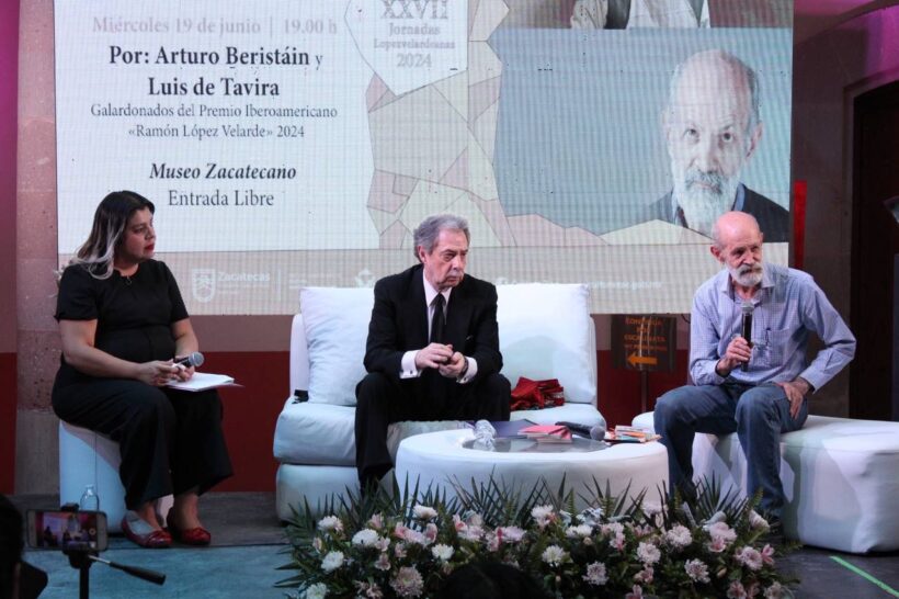 Luego de ser galardonados con el Premio Iberoamericano Ramón López Velarde, Arturo Beristáin y Luis de Tavira ofrecieron, en el patio del Museo Zacatecano, la Conferencia Magistral “López Velarde al Teatro”, que se tornó en un diálogo sobre el teatro, entre los zacatecanos, desde sus orígenes délficos hasta su desarrollo, en lo particular.