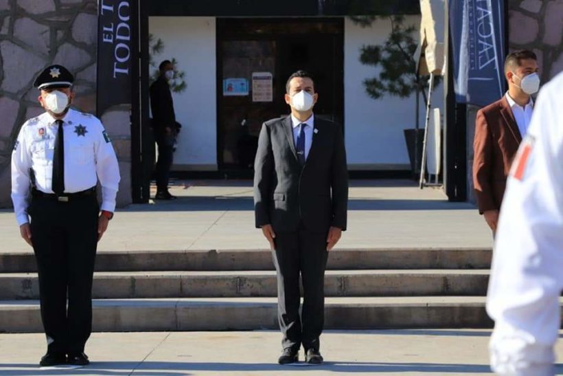 Como parte de la celebración por el Día de la Bandera, el Ayuntamiento de Zacatecas encabezado por el alcalde Ulises Mejía Haro, a través de la Policía de Proximidad Social y Protección Civil de la capital, realizó un solemne acto de honores al lábaro patrio.