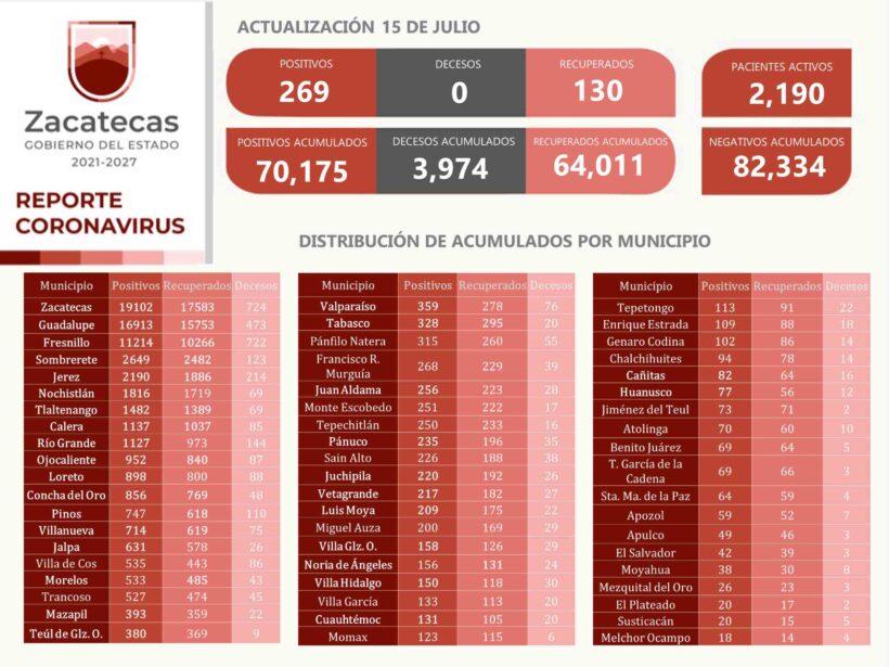 La Secretaría de Salud de Zacatecas (SSZ) informó que el municipio de Guadalupe registró a 108, Zacatecas a64, Fresnillo a 27, y el resto en: Concepción del Oro, Calera, Cañitas, Cuauhtémoc, Huanusco, Jalpa, Jerez, Juan Aldama, Juchipila, Loreto, Luis Moya, Mazapil, Nochistlán, Ojocaliente, Pánuco, Río Grande, Sombrerete, Tabasco, Teúl de González Ortega, Tlaltenango, Valparaíso, Vetagrande, Villa González Ortega, Villa Hidalgo y Villanueva.