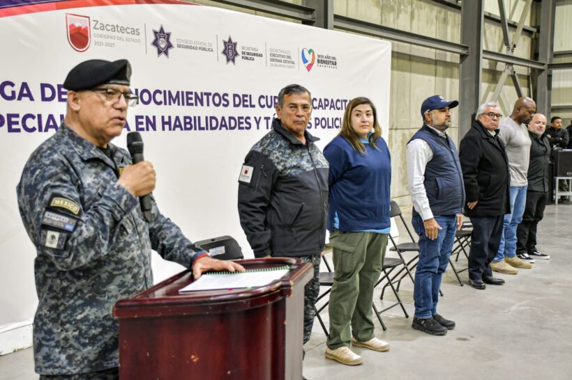 A través de la Secretaría de Seguridad Pública (SSP), el Gobierno de Zacatecas llevó a cabo la ceremonia de clausura del Curso de Capacitación Especializada en Habilidades y Tácticas Policiales, programa integral orientado a fortalecer la profesionalización de los cuerpos de seguridad y avanzar en las acciones de pacificación para el bienestar de las familias.
