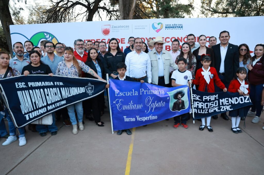 El mandatario estatal encabezó el arranque de este esquema de apoyo en la Escuela Primaria “Emiliano Zapata”, de la comunidad Tacoaleche, así como en la “Pedro Coronel”, de la colonia Arboledas, ambas del Pueblo Mágico de Guadalupe, donde canalizó cheques para que las madres y padres de familia adquieran los uniformes de sus hijas e hijos.