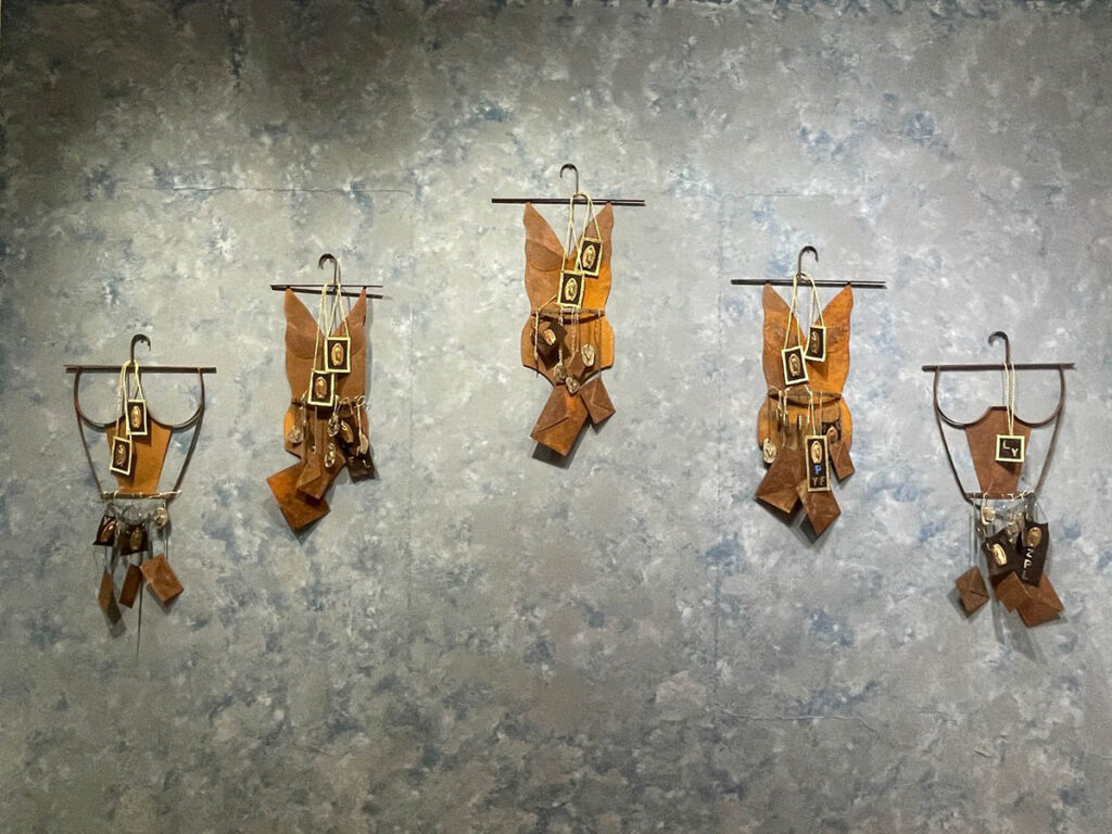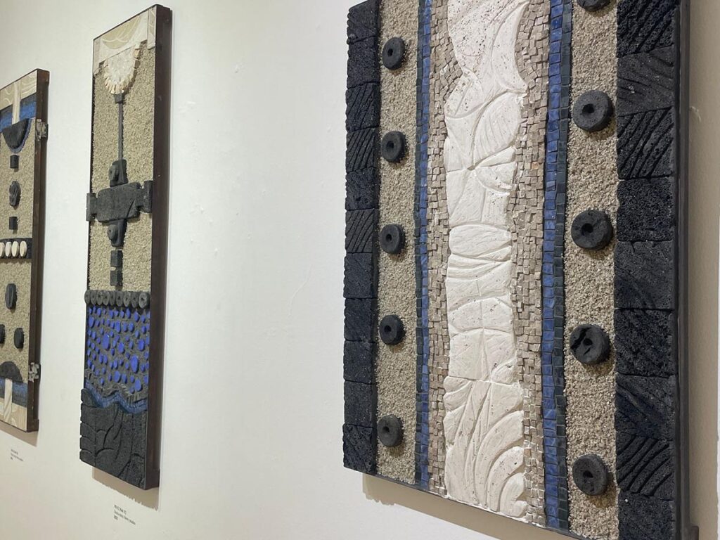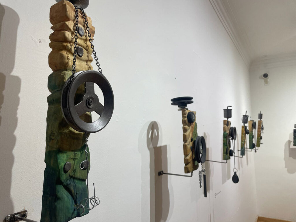 Dentro de la muestra destacan esculturas en madera tallada y policromada, con incrustaciones de piedras, metales y cristales. Estos elementos simbolizan la solidez y fragilidad de la arquitectura, al tiempo que establecen un diálogo entre lo natural y lo artificial.