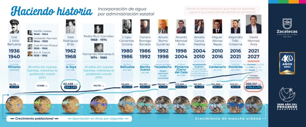 La semana pasada, dijo, el Gobernador David Monreal Ávila se posicionó como el gobernante que más agua ha aportado a la población dentro del área de influencia de la JIAPAZ, derivado de una estrategia integral que ha permitido recuperar, perforar e incorporar infraestructura hidráulica.