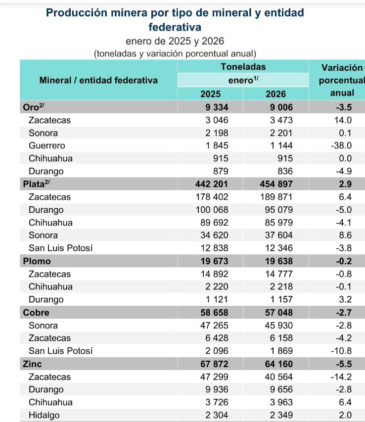 En otros metales, el comportamiento de la producción refleja la solidez del sector en la entidad. El plomo registró una producción de 14 mil 777 toneladas, manteniendo a Zacatecas en el primer lugar nacional.