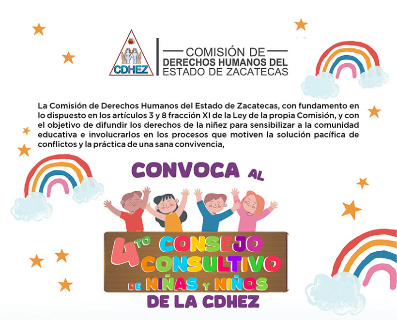La Comisión de Derechos Humanos del Estado de Zacatecas (CDHEZ) emitió la convocatoria para integrar el Cuarto Consejo Consultivo Infantil de Niñas y Niños, un espacio de participación que fortalece el ejercicio del derecho de la niñez a opinar, proponer y ser escuchada en la promoción y defensa de los derechos humanos.