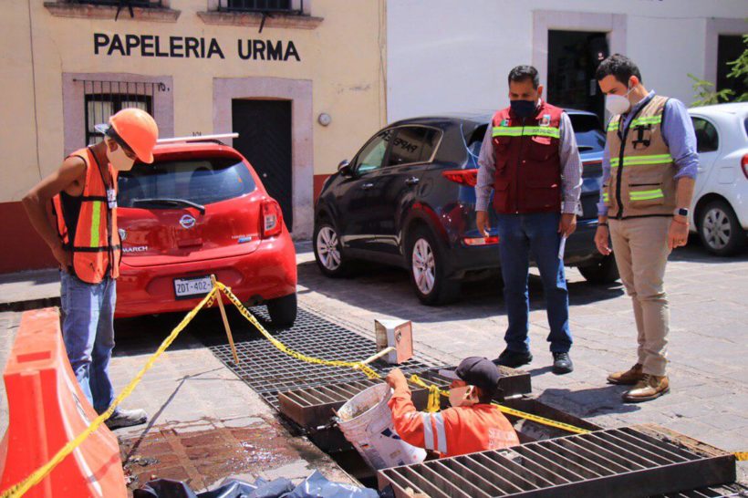 Con el fin de prevenir encharcamientos e inundaciones en las calles de la capital durante esta temporada de lluvias, el alcalde capitalino Ulises Mejía Haro ha instruido dar puntual mantenimiento y desazolve a las alcantarillas de diferentes puntos estratégicos del municipio, como es el caso de la calle Abasolo y el popular Callejón Ancho del centro histórico, donde además se realizan trabajos de mantenimiento «para seguir garantizando condiciones dignas en los espacios públicos», aseguró el primer edil.