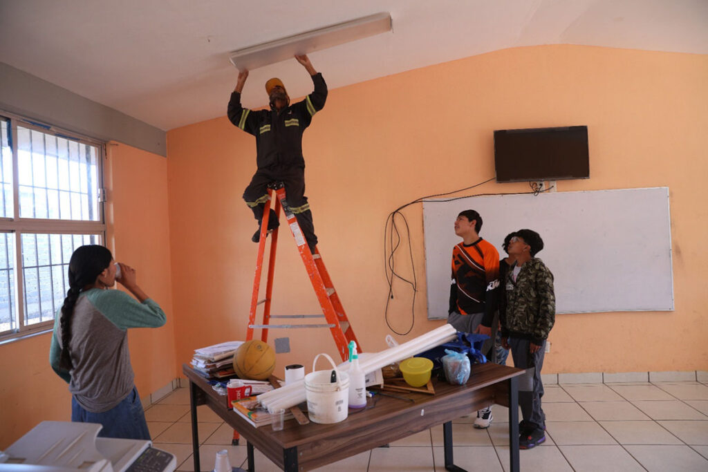 Asimismo, se realizaron trabajos de reparación de sanitarios, instalaron de lámparas, aplicación de impermeabilizante en techos de los salones, así como la colocación de cinta antiderrapante, en diferentes áreas de la telesecundaria; finalmente, se colaboró con la limpieza general de la escuela.