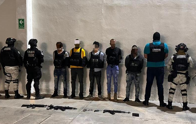 Los cinco hombres, quienes manifestaron ser integrantes del grupo delincuencial denominado Cártel Jalisco Nueva Generación, fueron detenidos y, junto con el armamento y demás objetos, puestos a disposición de la autoridad competente a fin de que se lleva cabo la indagatoria de ley.