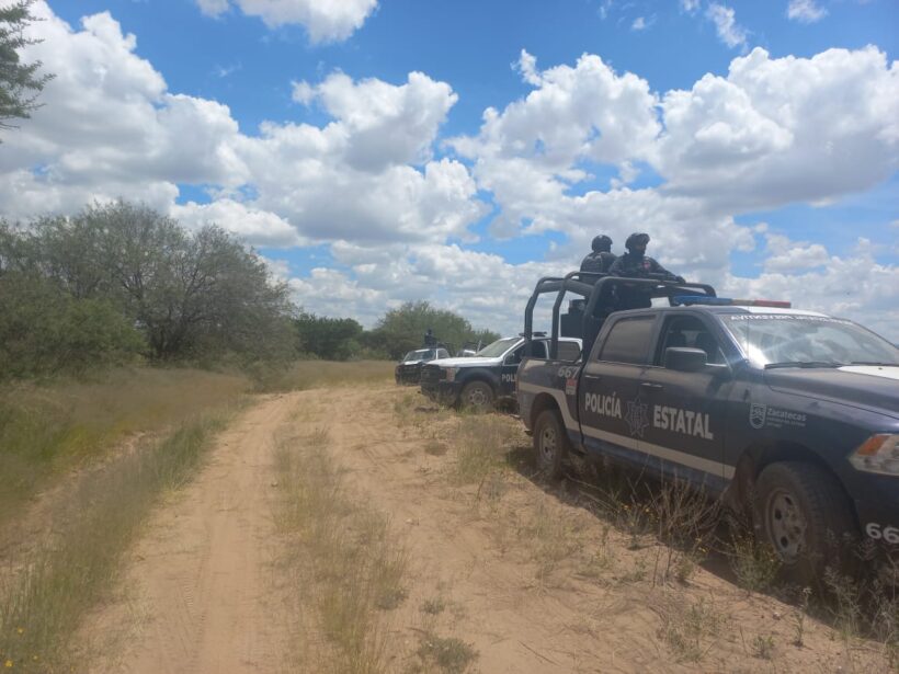 Durante los patrullajes sobre caminos de terracería en la comunidad General Lauro G. Caloca, del Municipio de Noria de los Ángeles, ubicaron un sitio que, por sus características y hallazgos, correspondía a un campamento utilizado por un grupo delincuencial, mismo que fue abandonado ante la llegada de las Fuerzas de Seguridad.