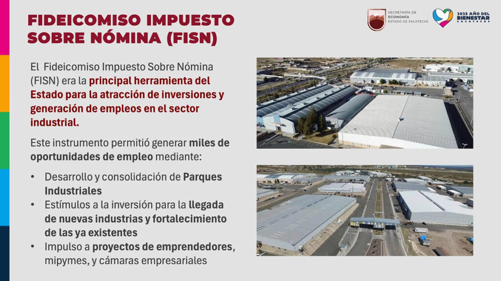 El Secretario de Economía, Jorge Miranda Castro, explicó que el Impuesto Sobre Nómina, que grava las remuneraciones recibidas por los trabajadores subordinados, anteriormente se canalizaba en su totalidad a través del Fideicomiso Impuesto Sobre Nómina (FISN), un fideicomiso público orientado a impulsar las inversiones productivas en Zacatecas.