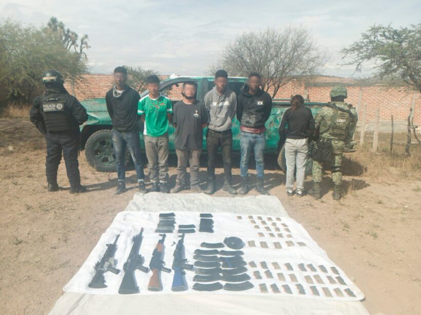 En el despliegue operativo, en el que participaron elementos de las Fuerzas de Reacción Inmediata Zacatecas (FRIZ) -de la Policía Estatal Preventiva-, Ejército Mexicano y Guardia Nacional, se detuvo a cinco hombres que señalaron ser integrantes de un grupo delictivo, identificado como Cártel Jalisco Nueva Generación.