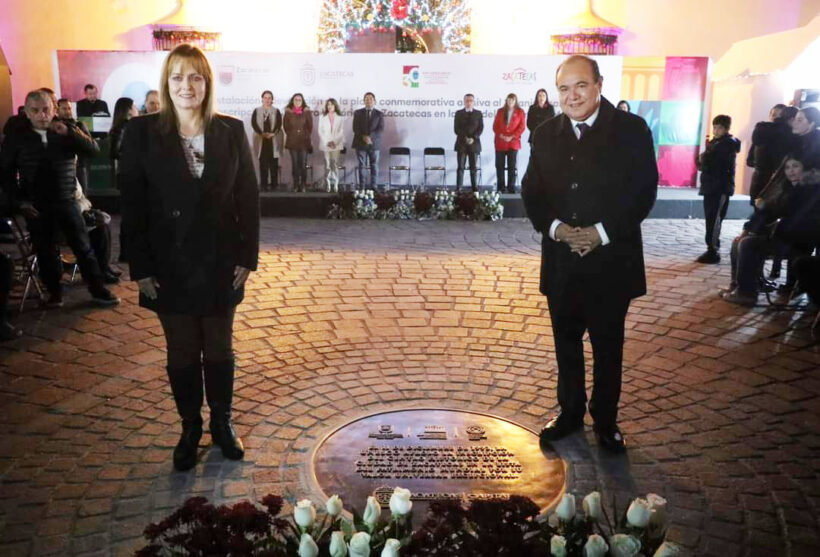 Autoridades municipales y estatales develaron la tarde de este domingo en Plaza de Armas la placa conmemorativa por el 30 aniversario de la inscripción del Centro Histórico de Zacatecas en la lista de ciudades Patrimonio Mundial de la UNESCO.