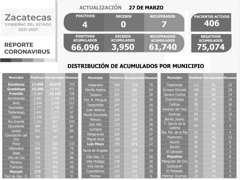 En tanto, hoy dieron positivo a las pruebas dos mujeres guadalupenses de 45 y 74 años, una mujer capitalina de 54 y un hombre mazapilense de 49 años. Todos se contagiaron de forma comunitaria y permanecen aislados en sus domicilios.