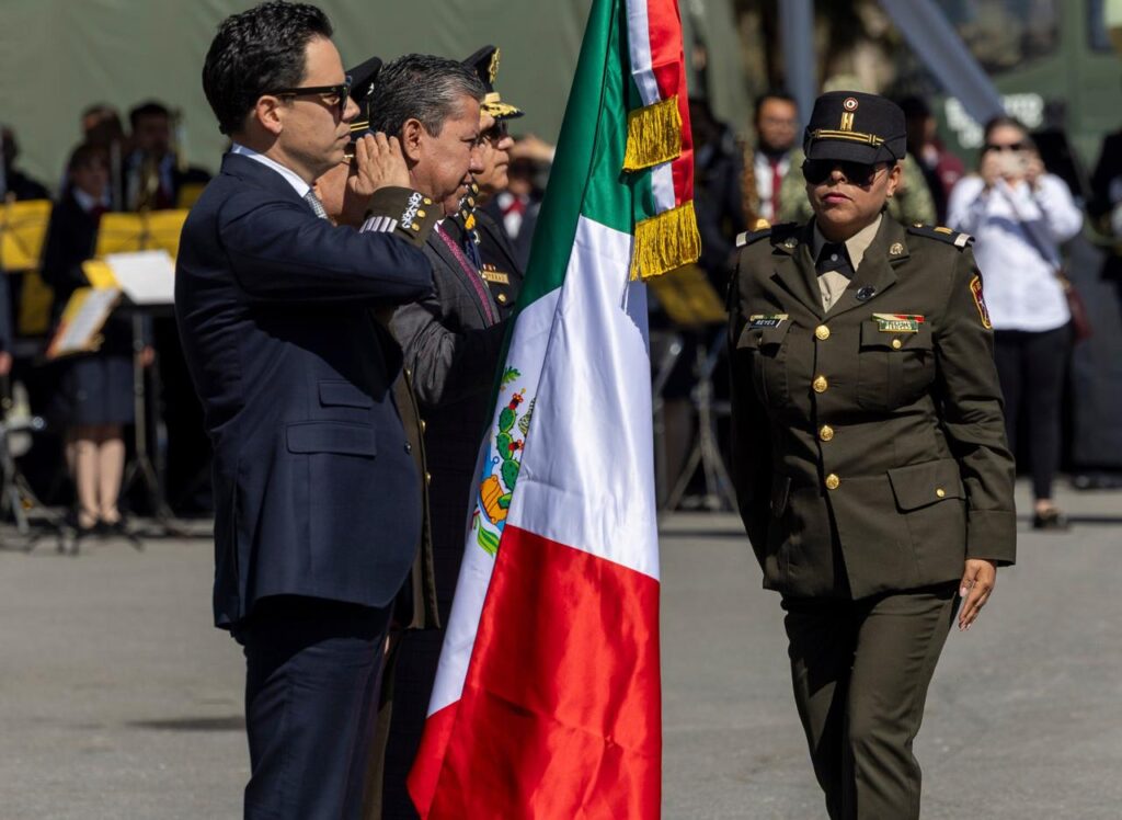 Acompañado por el Comandante de la Decimoprimera Zona Militar, Isaac Bravo López, el mandatario estatal expresó que “no es una fecha cualquiera”, se rinden honores a uno de los símbolos más profundos de la identidad nacional, “nuestra Bandera de México”.