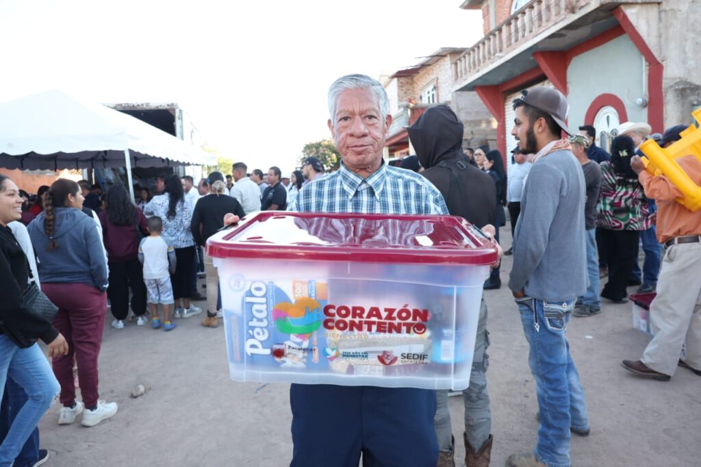 Durante su visita de trabajo a la comunidad Colonia Flores García, en Sombrerete, Zacatecas, el Gobernador David Monreal Ávila encabezó la entrega de 400 paquetes alimentarios del programa Corazón Contento, que opera a través del Sistema Estatal para el Desarrollo Integral de la Familia (SEDIF), destinado a personas de zonas rurales.