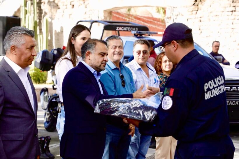 Reunidos en la Hacienda La Encarnación, en el Pueblo Mágico de Villanueva, alcaldes, policías y directores de Seguridad Pública de cinco municipios recibieron 238 juegos de uniformes, una grúa, una ambulancia, una patrulla, 70 cascos balísticos, una obra de infraestructura, ocho radios portátiles, 75 mejoras salariales para elementos policiales y tres nuevos modelos de justicia cívica.