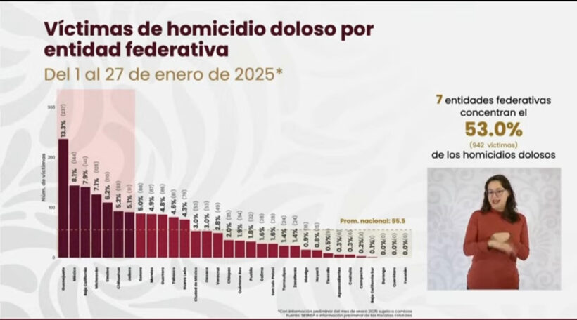 En ese sentido, se reportó que siete entidades federativas concentran el 53.0 por ciento de los homicidios dolosos en el inicio de 2025, con 942 víctimas: Guanajuato, con el 13.3 por ciento; el Estado de México, con 8.1; Baja California, con 7.9; Michoacán, con el 7.1; Sinaloa, con el 6.2; Chihuahua, con el 5.2; y Jalisco, con el 5.1 por ciento.