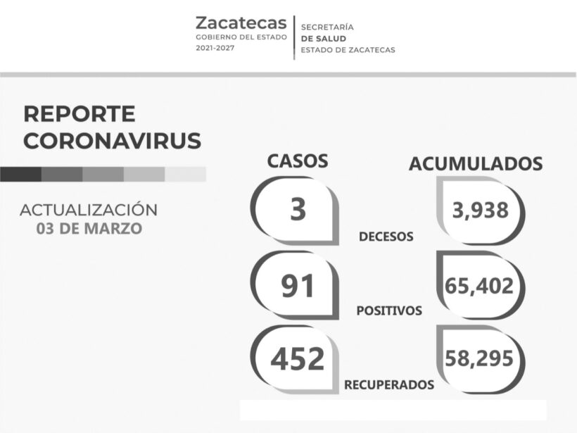 Otras 452 personas dejaron atrás el COVID-19 en las últimas 24 horas; además, la Secretaría de Salud de Zacatecas (SSZ) informó que hubo 91 nuevos casos positivos y tres decesos asociados a la enfermedad.