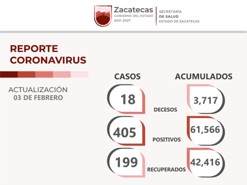 Para este jueves, el reporte de la situación del COVID-19 en Zacatecas arroja la recuperación clínica de 199 personas, 405 nuevos casos y 18 decesos, aunque sólo dos de los fallecimientos ocurrieron en el presente mes, los 16 restantes se registraron en enero.