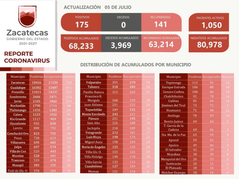 En las últimas 24 horas, la Secretaría de Salud de Zacatecas (SSZ) registró 175 nuevos contagios de COVID-19, 141 personas libres del virus SARS-CoV-2 y ningún deceso asociado al mismo. En total, son 68 mil 233 positivos confirmados y 63 mil 214 los recuperados.