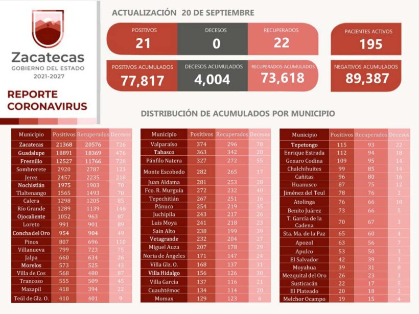 Zacatecas continúa sin registrar fallecimientos relacionados alCOVID-19;informó la Secretaría de Salud de Zacatecas (SSZ) que, este día, contabilizó a22 personas recuperadas y21 casos positivosa la enfermedad.